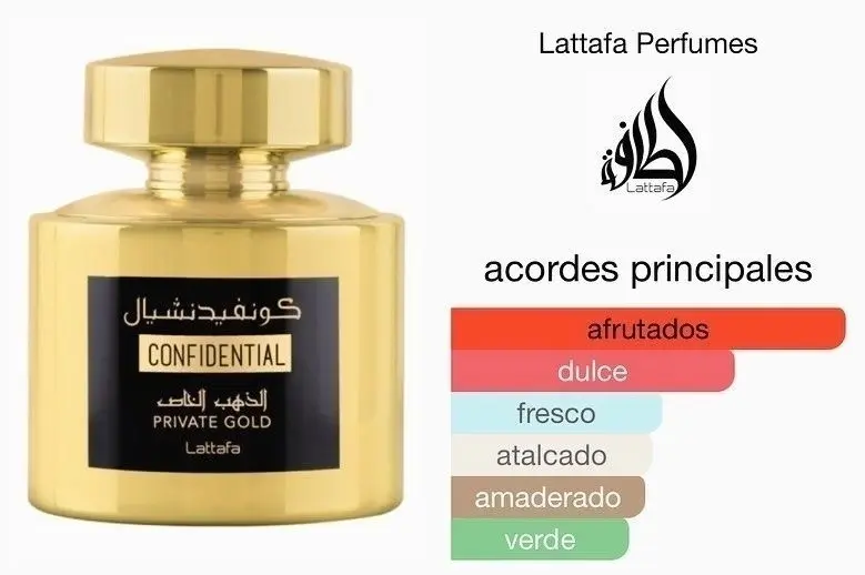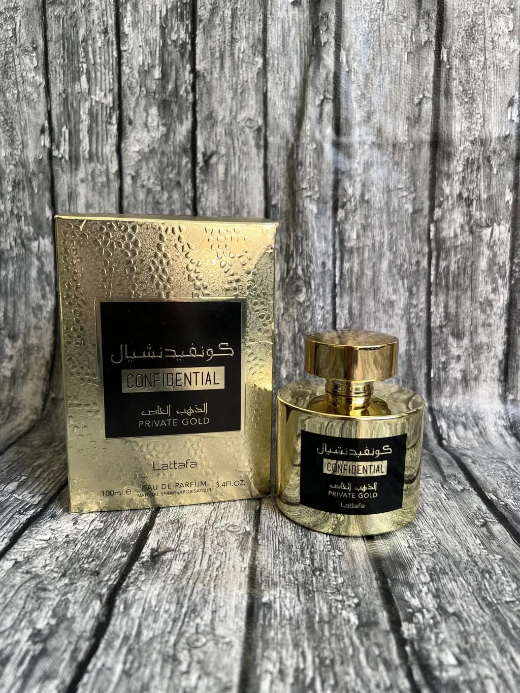 Confidential Private Gold de Lattafa Perfumes es una fragancia de la familia olfativa Chypre Fruity para Hombres y Mujeres. Las Notas de Salida son melocotón, pera, maracuyá, frambuesa y cassis; la nota de corazón es lirio de los valles; las notas de fondo son almizcle, vainilla, sándalo, pachulí y heliotropo.