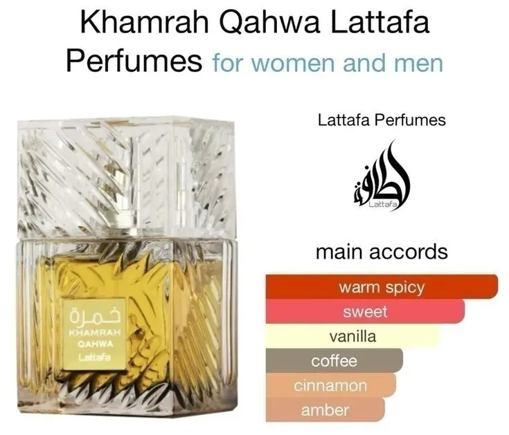 Khamrah Qahwa de Lattafa Perfumes es una fragancia para mujeres y hombres. Esta es una nueva fragancia. Khamrah Qahwa se lanzó en 2023. Las notas altas son canela, cardamomo y jengibre; las notas medias son praliné, frutas confitadas y flores blancas; las notas de base son café, vainilla, grano de tonka, benzoin y almizcle.