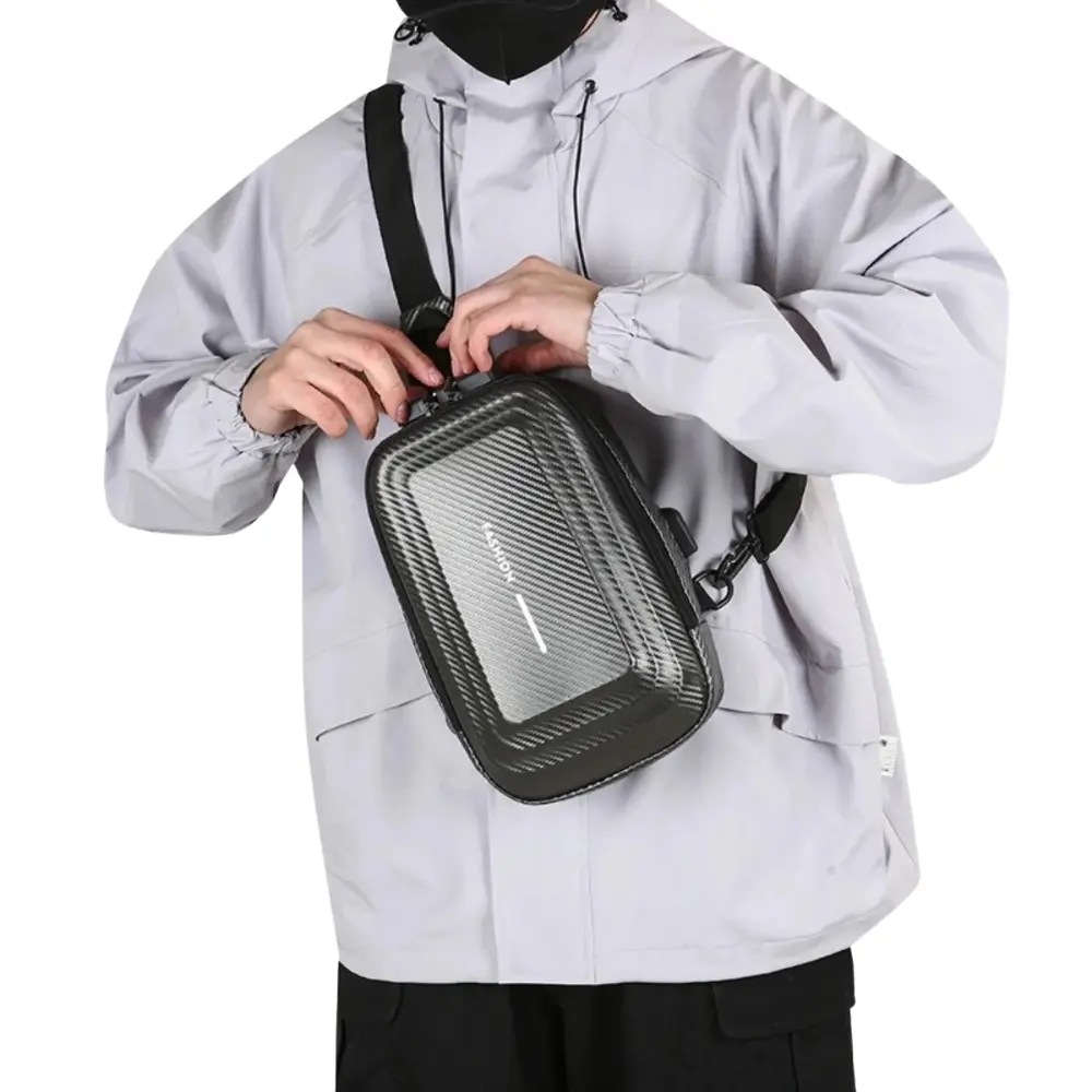 Diseñada con material impermeable, soporta lluvias y salpicaduras, ideal para uso urbano o viajes. Su tamaño compacto y diseño ergonómico permiten llevarla cómodamente cruzada al cuerpo, dejando tus manos libres y asegurando mayor control.