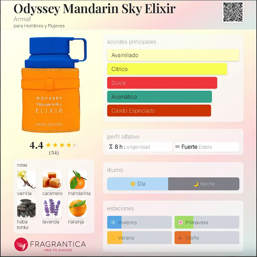 Odyssey Mandarin Sky Elixir de Armaf es una fragancia de la familia olfativa Oriental Amaderada para Hombres y Mujeres. Esta fragrancia es nueva. Odyssey Mandarin Sky Elixir se lanzó en 2025. Las Notas de Salida son mandarina, lavanda, naranja, cardamomo y pimienta negra; las Notas de Corazón son caramelo, haba tonka, incienso y pachulí; las Notas de Fondo son vainilla y vetiver.